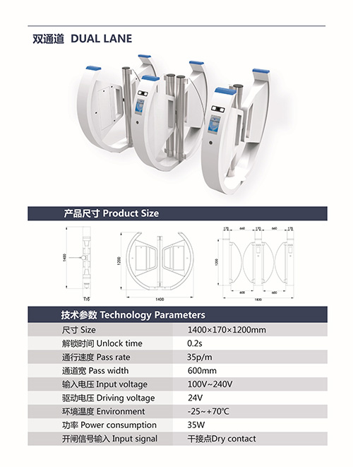 R3012 1.尺寸: 1400x170x1200mm 2.解鎖時間: 0.2s 3.通行速度: 35p/m 4.通道寬: 600mm 5.輸入電壓: 100v~240v 6.驅(qū)動電壓: 24v 7.環(huán)境溫度: -25~+70℃ 8.功率: 35w 9.開閘信號輸入: 干接點(diǎn) 10.產(chǎn)品包裝: 紙箱+珍珠棉 11.產(chǎn)品型號: R3012